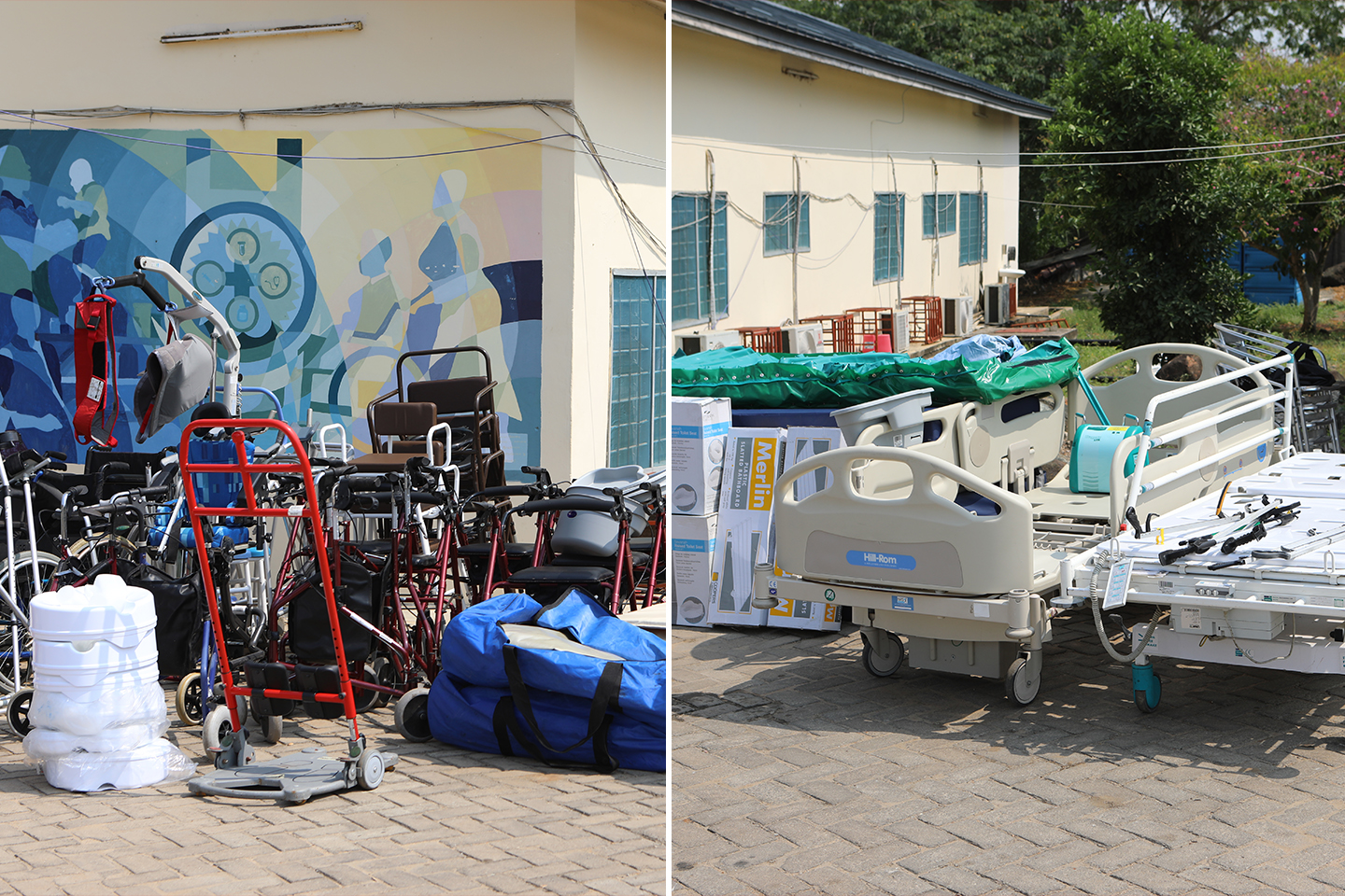Among the items donated, bequeathed by Millbrook Health Care in the UK, were 10 tri walkers, 16 rollators, 44 foldable walking aids, 106 adjustable walking aids (sticks), 25 Buckingham caddies, 12 chairs, 37 raised toilet seats, 10 male urinal containers, 20 therapeutic mats, 35 mattresses and 14 hospital beds.