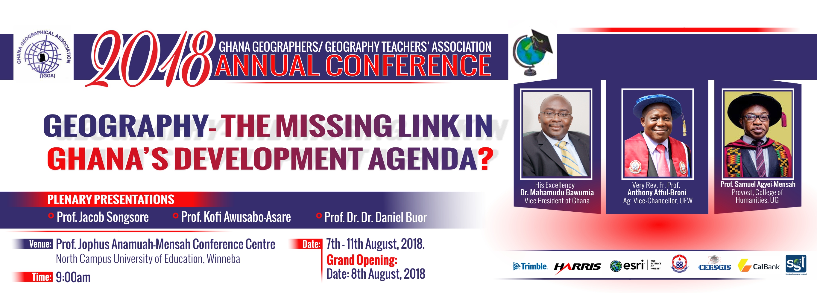 The theme for the GGA/GGTA Annual conference 2018 is “Geography – The Missing Link in Ghana’s Development Agenda?”. This theme is necessitated by the fact that in the overall scheme of Ghana’s development drive, the concept of Geography and Geographers seems to be relegated to the background, leaving a huge development gap and sustainability questions.