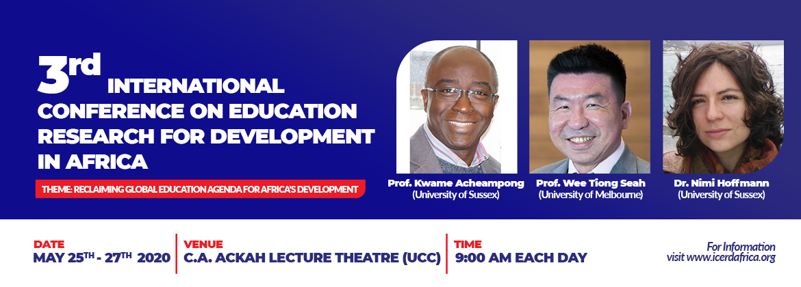 The Colleges of Education Studies and Distance Education, the University of Cape Coast in collaboration with the University of Sussex, UK is organizing the 3rd International Conference on Education Research for Development in Africa, 2020 on the theme "Reclaiming Global Education Agenda for Africa's Development" at the University of Cape Coast from Wednesday 25th - Friday 27th May 2020.