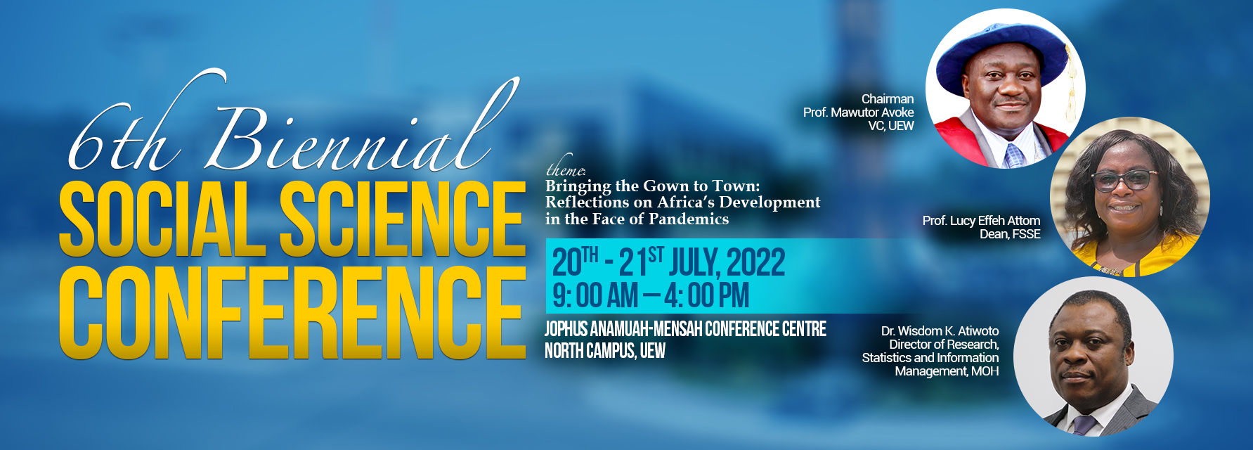 The Faculty of Social Science Education of the University of Education, Winneba, (UEW) Presents The 6th Biennial Social Science Conference on the theme: “Bringing the Gown to Town: Reflections on Africa’s Development in the Face of Pandemics”. The conference is scheduled to take place as follows: