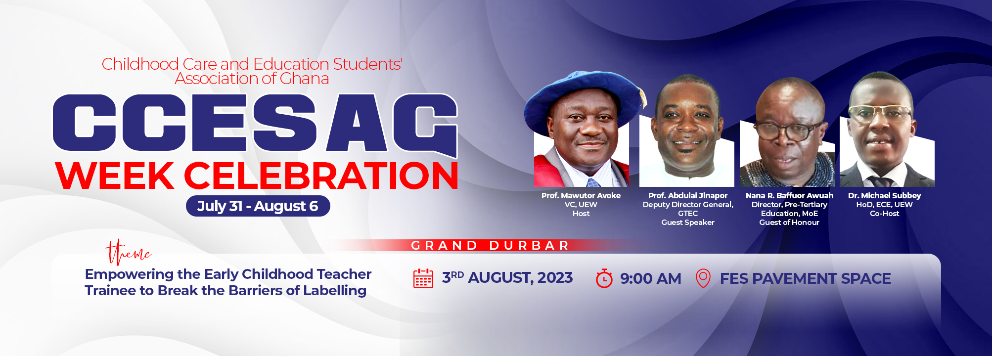 The Childhood Care and Education Students’ Association of Ghana (CCESAG) is having its Week Celebration from July 31 - August 6, 2023. As part of the celebration, the Association is inviting the University community to a Grand Durbar & Exhibition Show scheduled as follows: