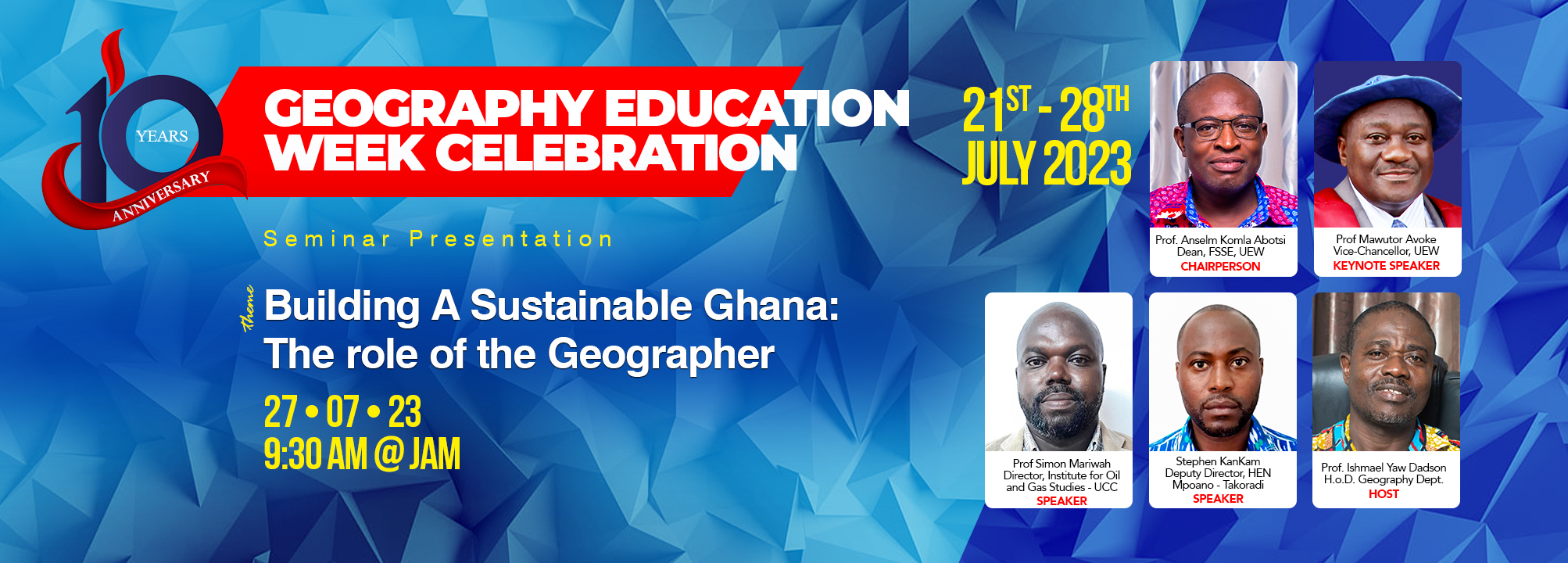 The Department of Geography Education, UEW is 10 years. Its 2023 Week Celebration is scheduled to take off from 21st - 28th July 2023. As part of the celebration, the Department is inviting the University community to a seminar scheduled as follows: