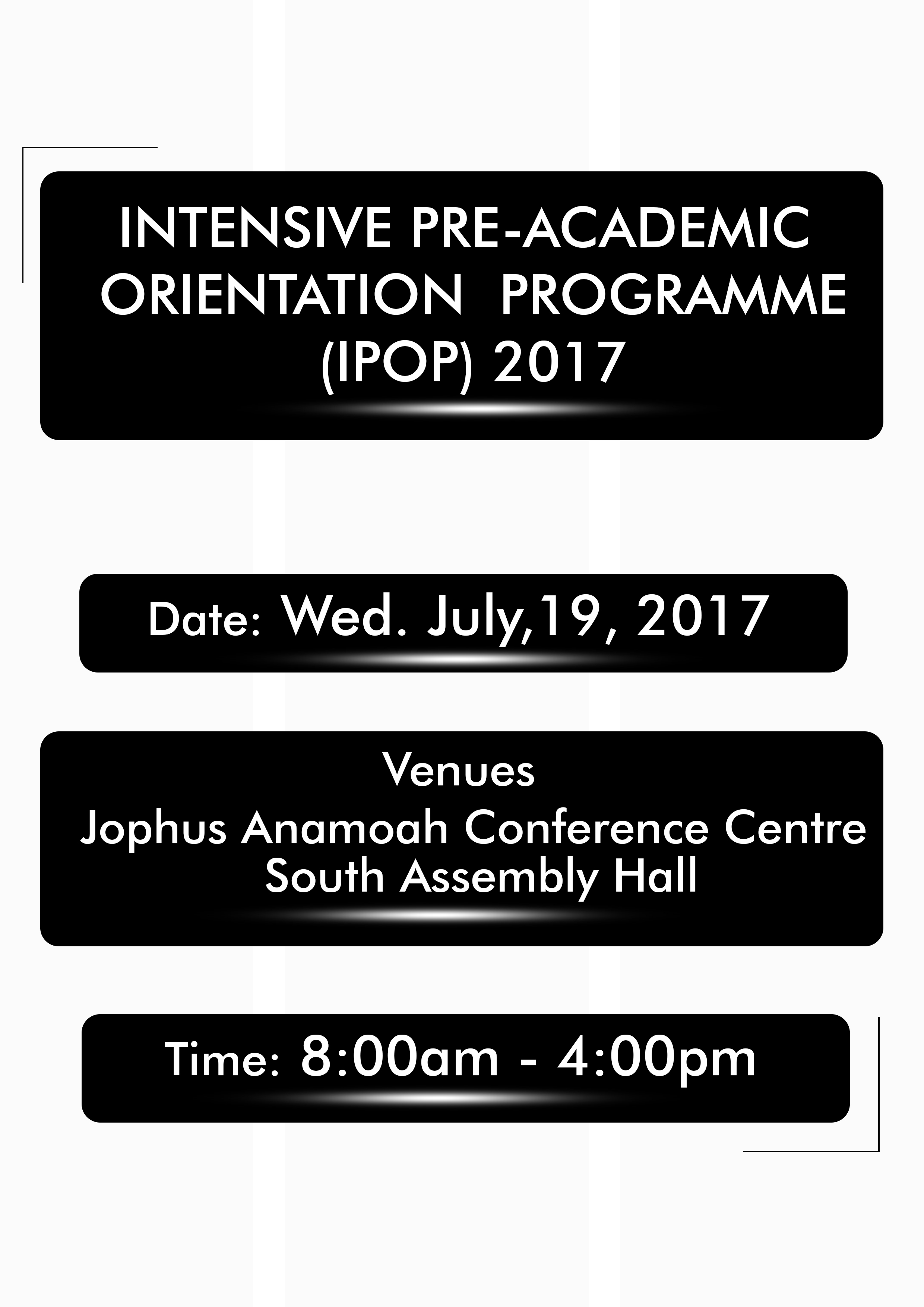 The Office for the Dean of Student Affairs wishes to inform all staff and students of a 1-day Intensive Pre-academic Orientation Programme (IPOP) for all fresh Undergraduate and Postgraduate sandwich students for the 2016/2017 academic year.