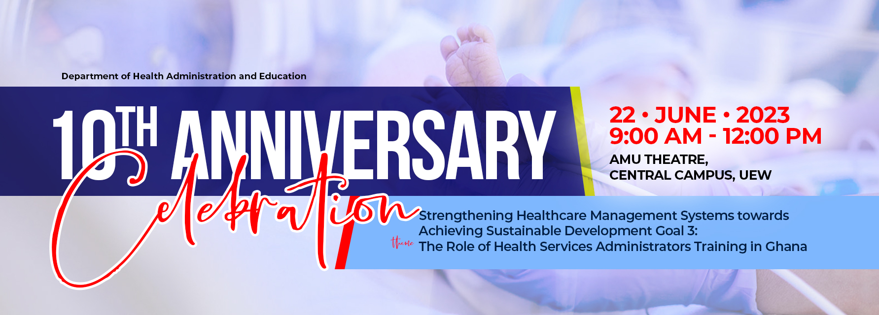 The Department of Health Administration and Education, University of Education, Winneba is celebrating its 10th Anniversary under the theme "Strengthening Healthcare Management Systems towards Achieving Sustainable Development Goal 3: The Role of Health Services Administrators Training in Ghana. The climax of the anniversary celebration is scheduled as follows: