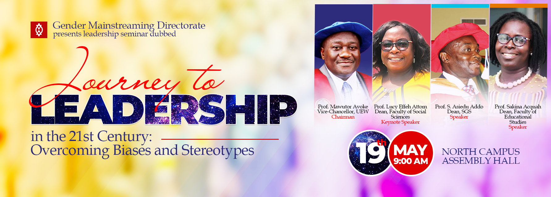 The Gender Mainstreaming Directorate in partnership with the NUGS Women’s Commission, GRASAG Gender Commission, Movement for Gender Development, and Gender Club-UEW invites you to this year’s leadership conversational series dubbed “Women’s Journey to Leadership”. This event intends to host distinguished female and male leaders who are touching lives and impacting their generations to share their leadership experiences on their core values that have guided them into reaching the highest pinnacle of their careers. The Seminar is scheduled as follows: