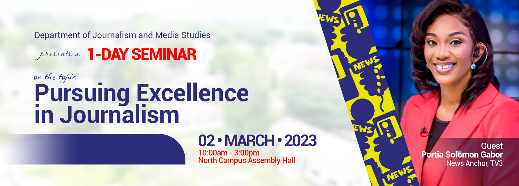 The Department of Journalism and Media Studies would organise a One-Day Seminar on “Pursuing Excellence in Journalism”. The guest for the seminar is Portia Solomon Gabor, a News Anchor at TV3 Ghana and the 2022 GJA Journalist of the Year. The seminar is scheduled to take off as follows: