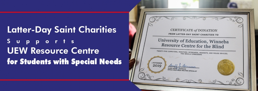 The Latter-Day Saint Charities on Friday, 1st November, 2019 donated 25 sets of refurbished computers and headphones and two computerized Braille Embossers to the Resource Centre for Students with Special Needs of the University of Education, Winneba (UEW).
