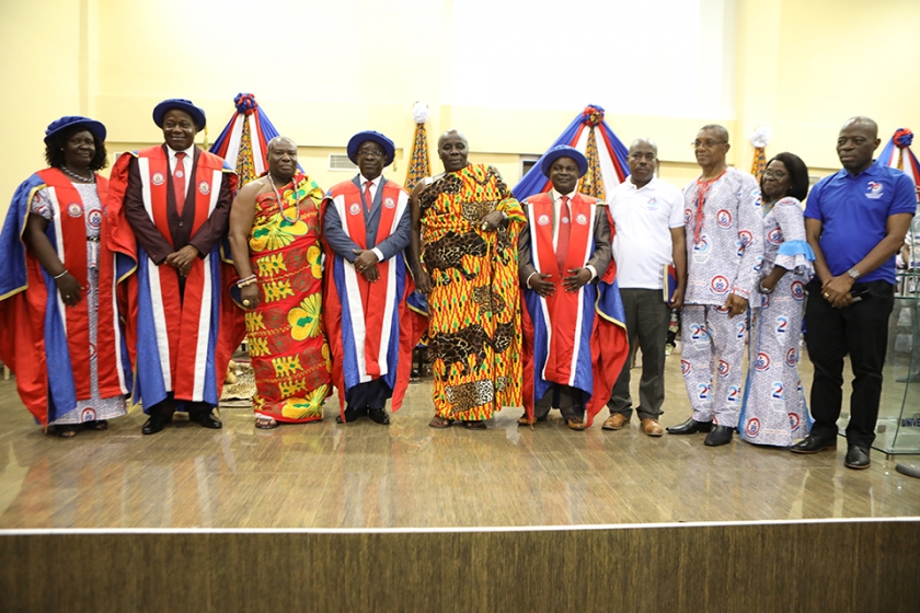 Okyenhene, Osagyefo Amoatia Ofori Panin II in a group photograph with the Omanhene, Neenyi Ghartey VII and UEW Management
