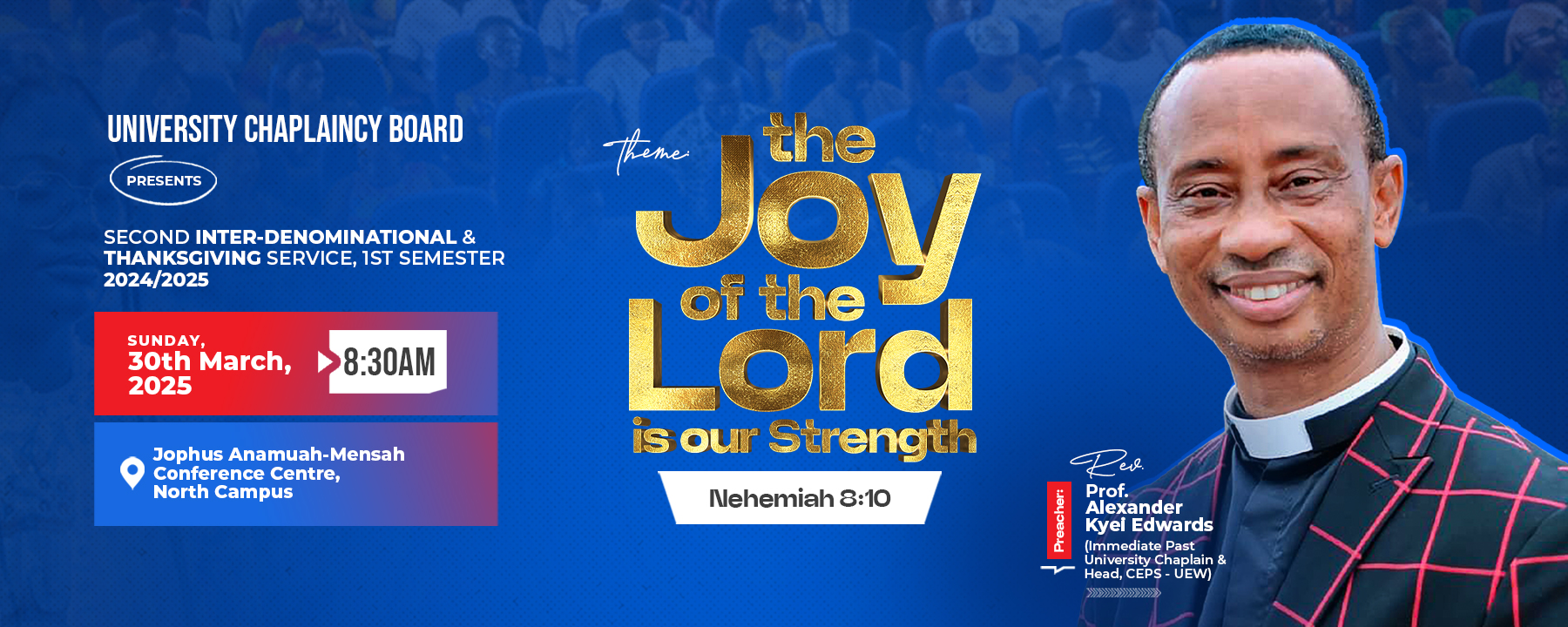 The Office of the Chaplain cordially invites all members of the University community to the Second Inter-Denominational Thanksgiving Service for the first semester of the 2024/2025 Academic Year. This special gathering is a time for reflection, gratitude, and spiritual renewal as we come together to celebrate the joy and strength we find in our faith.