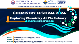 Chemistry Festival 2024 Ayensu River Estuary, Winneba Thursday, August 22, 2024 9:00 AM ASAF Outreach Programme North Campus Assembly Hall, University of Education, Winneba Friday, July 26, 2024 8:00 AM - 1:00 PM Empowering Girls Through Menstrual Hygiene Awareness SLT7 Block, South Campus Tuesday, May 28, 2024 10:00 AM