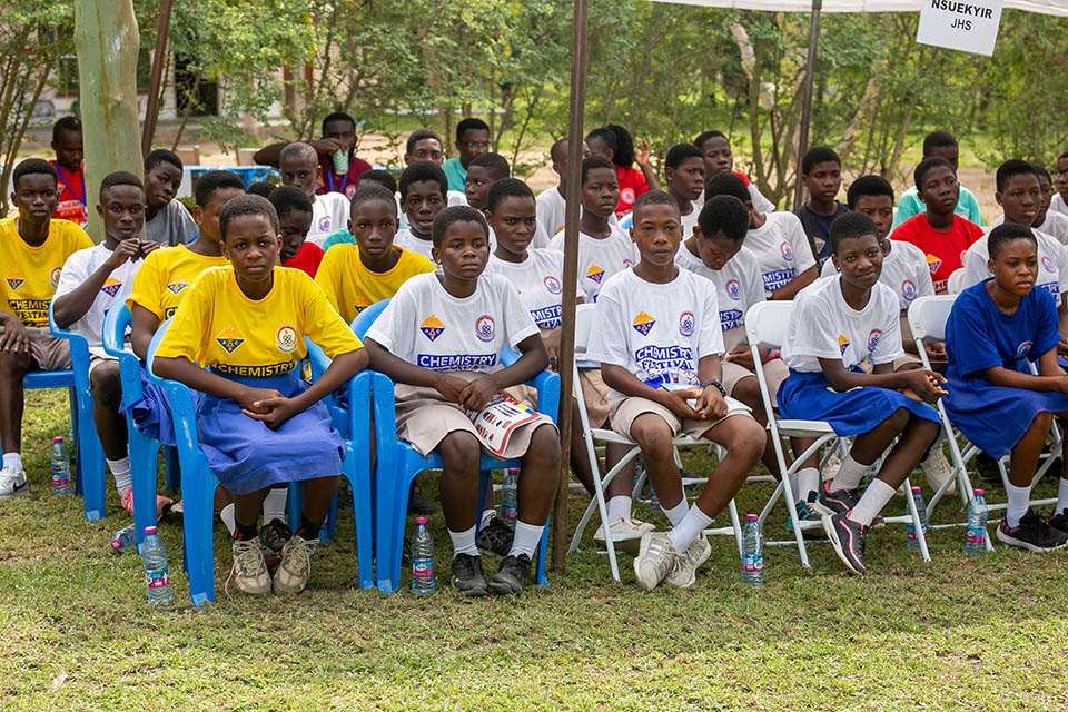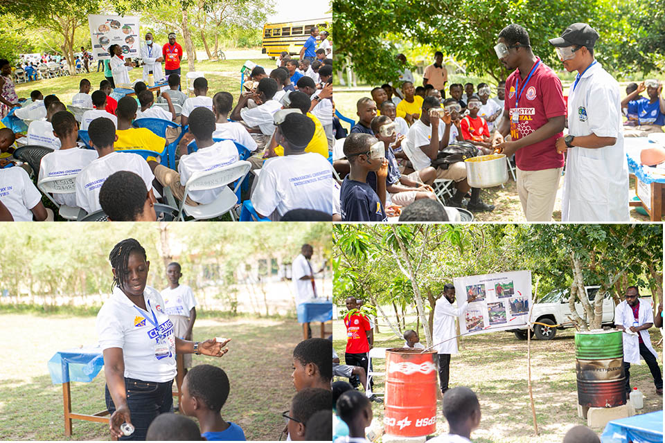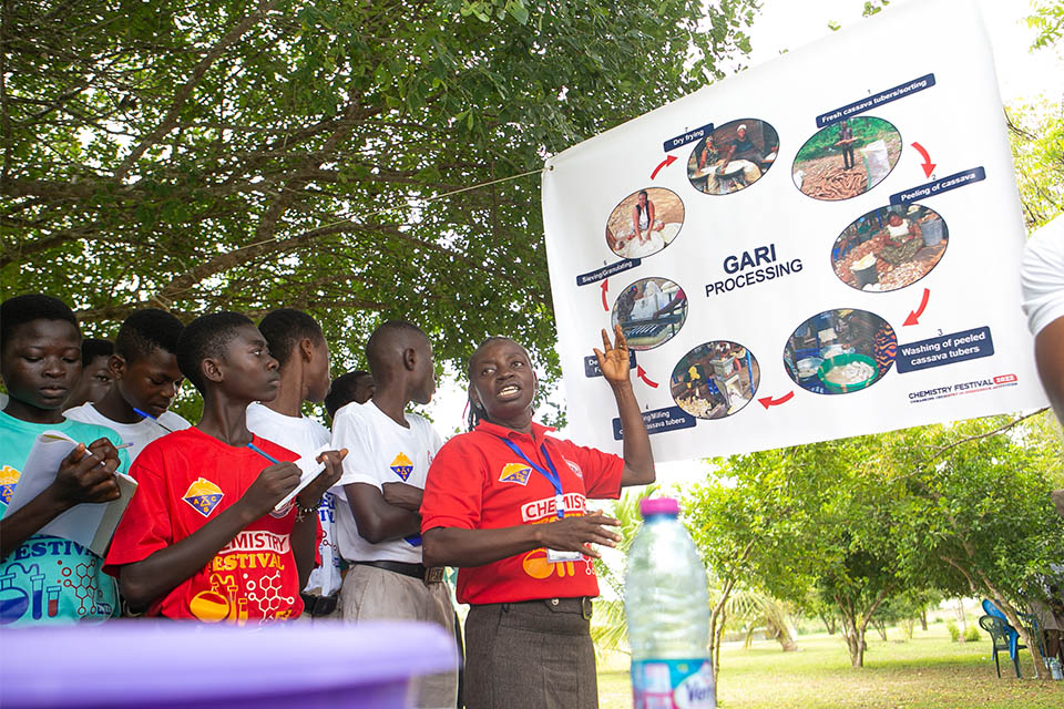 The goal of the festival is to engage the community in demystifying the role of chemistry in their daily lives through hands-on practical activities. As part of the celebration, 188 JHS students from Nsuekyir MA, Gyahadze MA, Methodist Rafiki and Gyangyanadze MA learned chemistry concepts in the production of akpeteshie (local gin), gari, palm oil and the use of wood ash lemon as indigenous agents for cleansing.