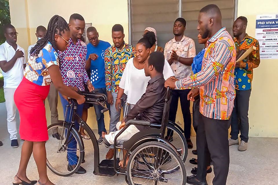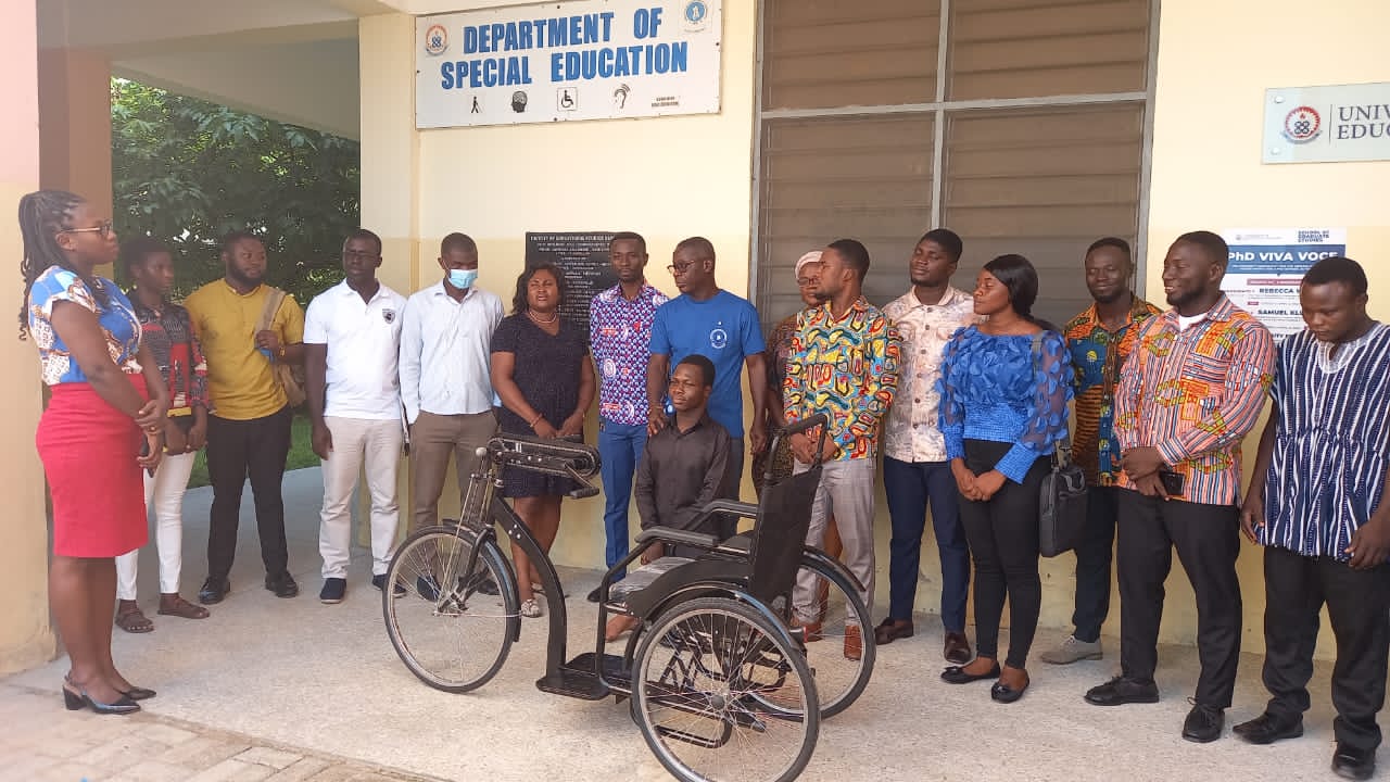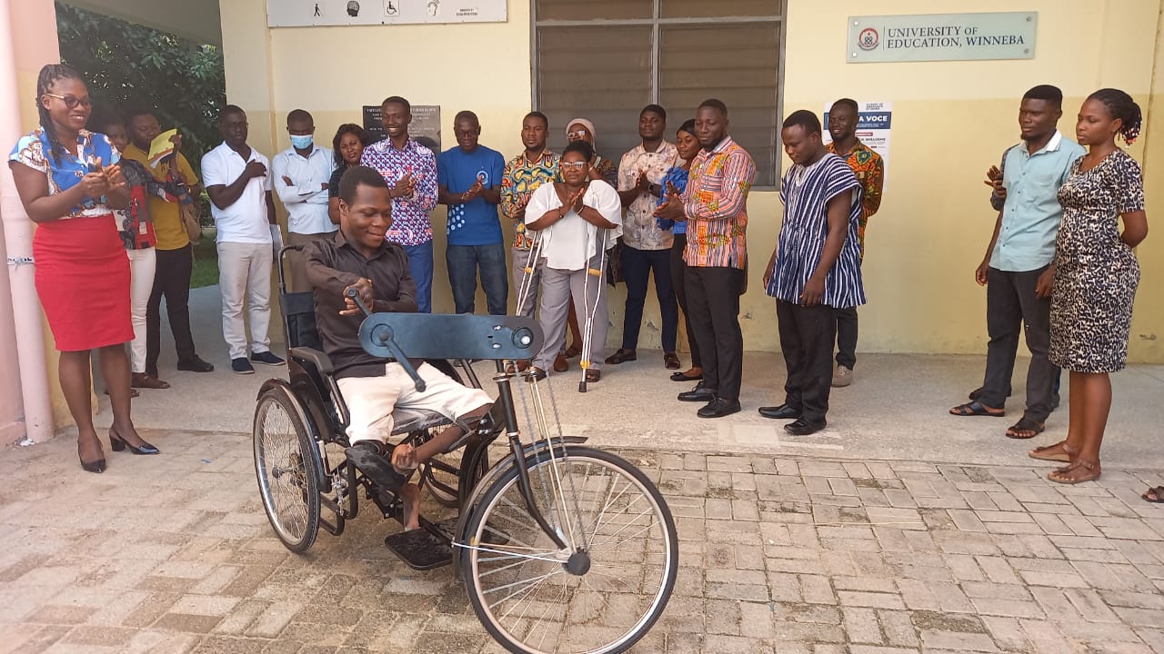 Mr. Bright Zinaneeba, a level 100 mobility challenged student in the Department of Special Education (SPED), University of Education, Winneba (UEW), has been supported with a custom-made tricycle to enable him to attend lectures and other social functions on time.