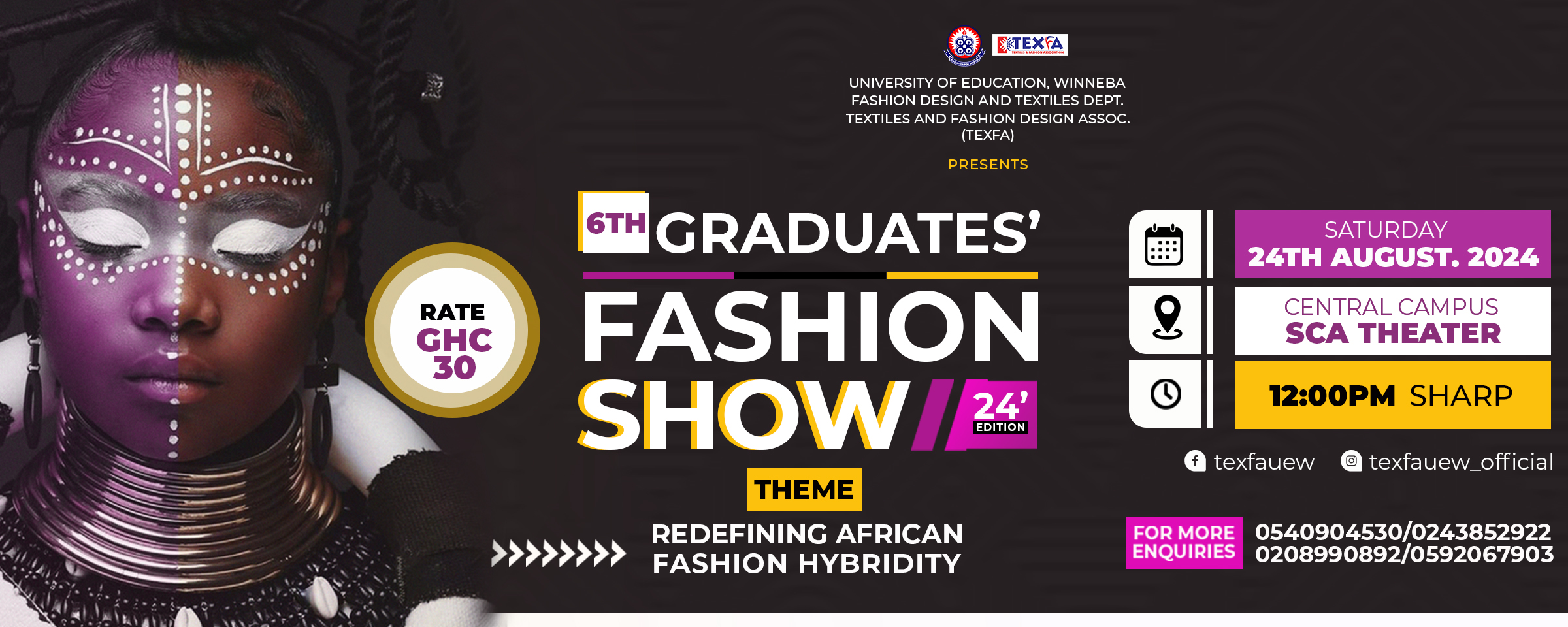 The Department of Textiles and Fashion Education at the University of Education, Winneba (UEW), proudly presents its 6th annual fashion show, showcasing the creative talents of final-year students. This spectacular event marks the culmination of their academic journey as they strut their stuff on the catwalk, displaying their innovative designs and skills.