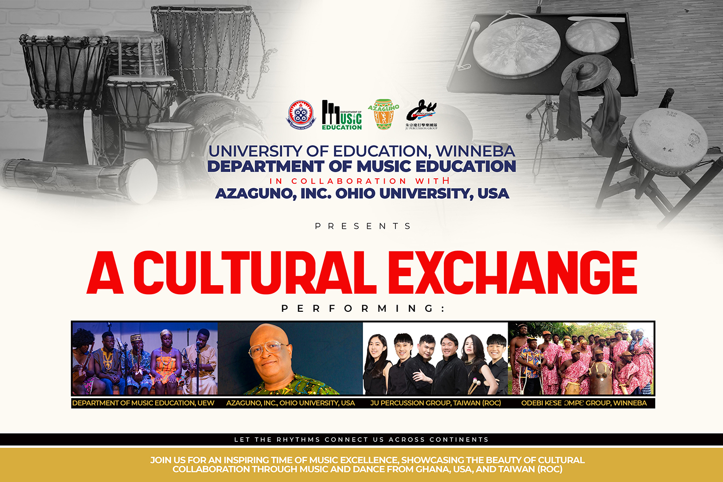 The Department of Music Education, University of Education, Winneba, in collaboration with Azaguno, Inc., Ohio University, USA, announces a special event titled: A Cultural Exchange.This cross-cultural musical experience will feature captivating performances by the Department of Music Education, UEW; Azaguno, Inc., Ohio University, USA; JU Percussion Group, Taiwan (ROC); and the Odebi Kese Ompe Group, Winneba, under the theme: Let the Rhythms Connect Us Across Continents.