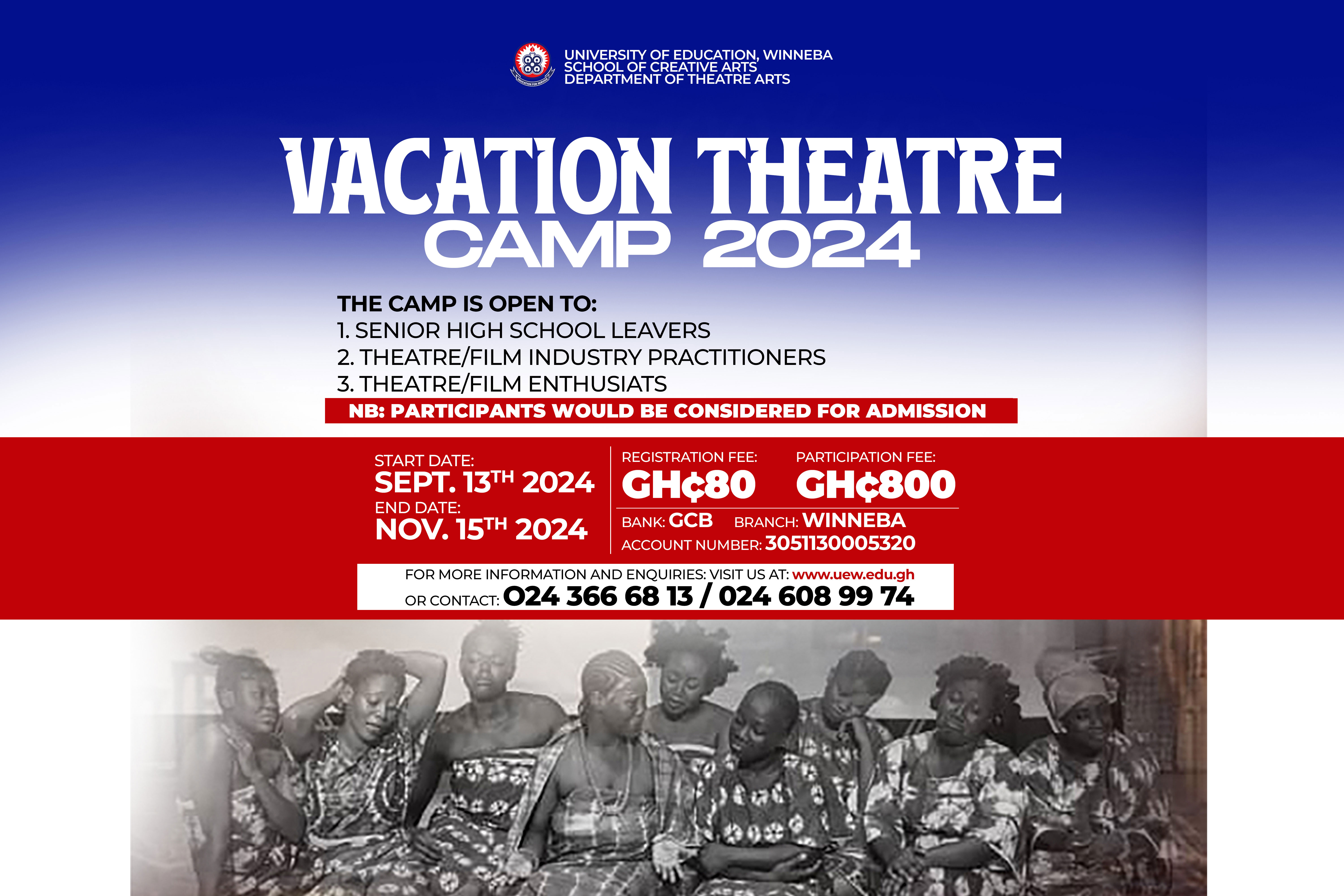 The Department of Theatre Arts at the University of Education, Winneba is pleased to announce the Vacation Theatre Arts Camp for the upcoming long vacation. This programme offers intensive yet interactive training in the introductory aspects of performance, including acting, scriptwriting, directing, and TV/film production.
